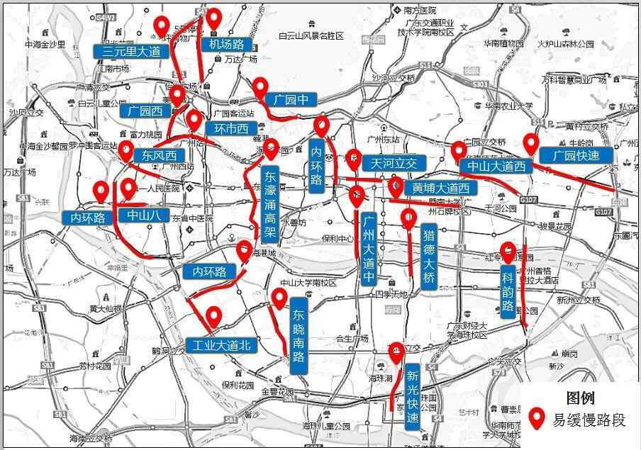 市内拥堵路段主要集中在内环路、环市路、广园路、东风西路、广州大道、广园快速路、科韵路、增槎路等主干道及进出城通道,高峰时段易出现一定长度的车流缓行。
