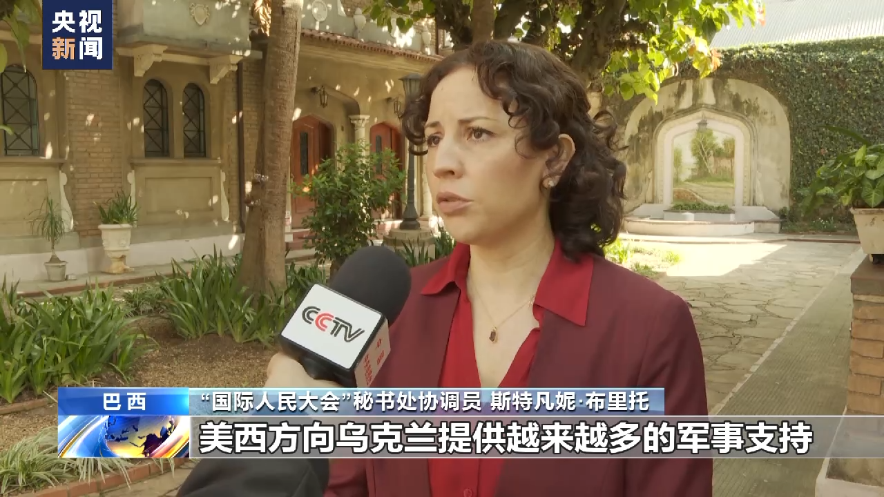 “国际人民大会”秘书处协调员 斯特凡妮·布里托:美西方向乌克兰提供越来越多的军事援助,只会让战争持续更久,这是一个悲剧。过去一年半,俄乌之间曾有过和谈的机会,和谈也应该是问题解决之道。但美国作为幕后推手并不希望和谈。因为俄乌冲突持续,美国有利可图。