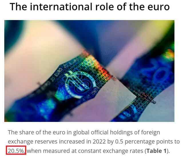 欧洲央行当地时间21日发布题为《欧元的国际作用》的报告。报告称,2022年欧元在各国外汇储备中的份额上升了0.5个百分点,占20.5%,稳居第二位。