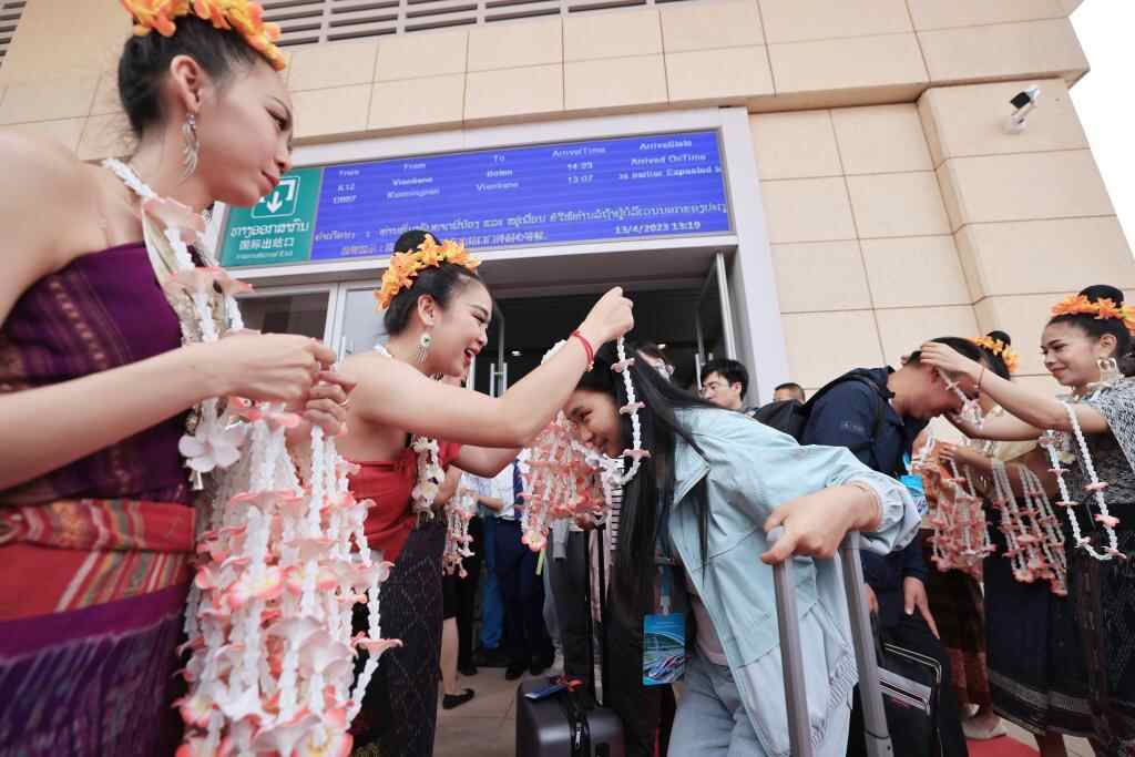 4月13日,在老挝磨丁站,工作人员欢迎乘坐D887次国际旅客列车的旅客。新华社记者 邢广利 摄