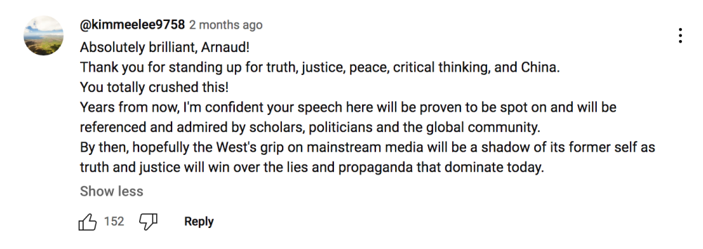 有网友留言说,贝特朗“为真相、正义、和平、批判性思维和中国挺身而出”,“多年以后,我相信你的演讲将被证明是正确的,会得到学界、政界和国际社会的引用和赞许”。