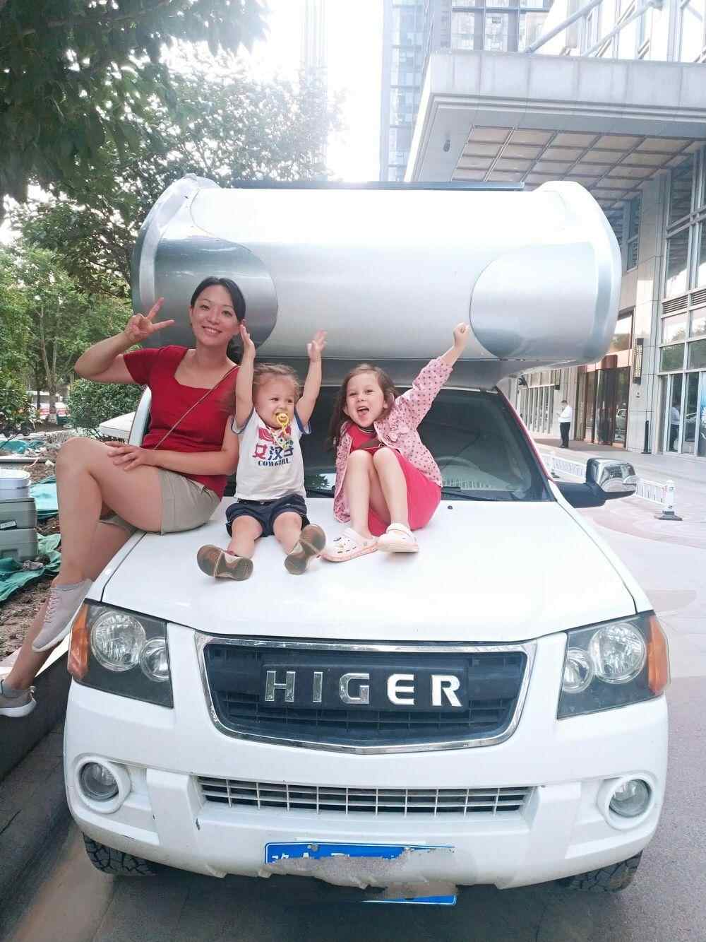 2021年7月,贝特朗一家人在西北环线自驾游出发前和租用的房车合影。(图片由受访者提供)