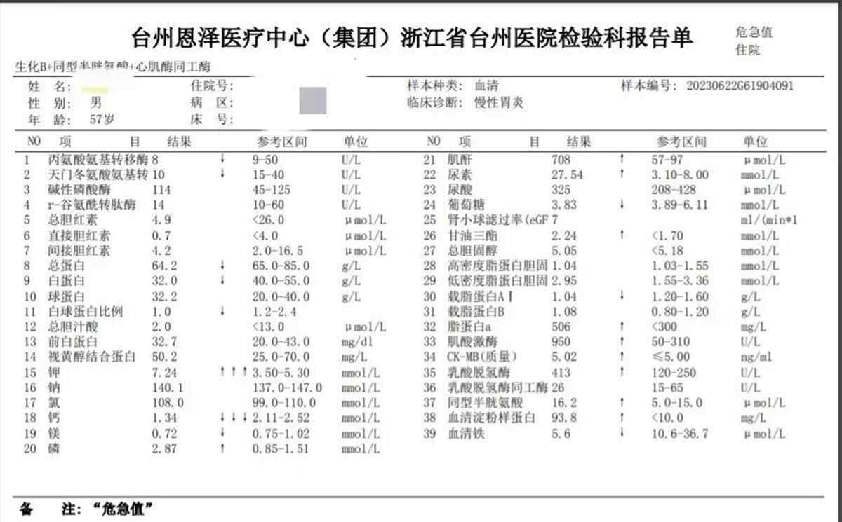 6月21日,温岭的林先生忽然浑身乏力,双腿都抬不起来,遂赶紧到台州医院办理住院手续并做了化验。化验结果显示,他血钾为7.24mmol/L,已经超过6.2mmol/L的危急值。