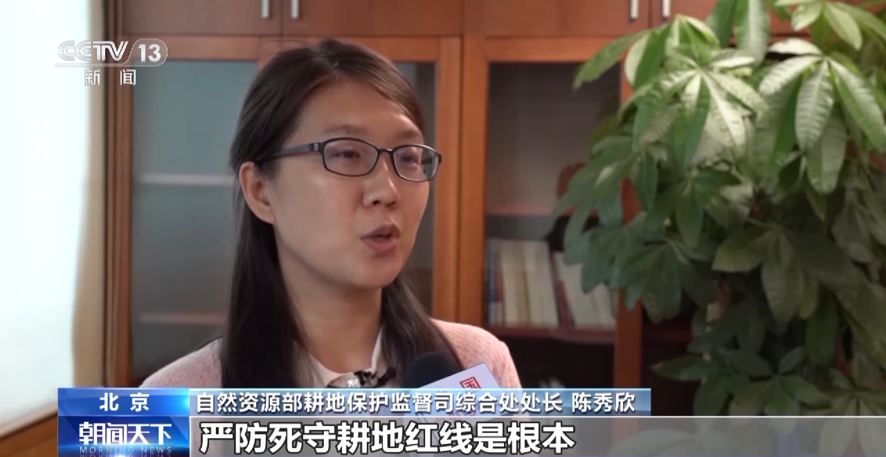 自然资源部耕地保护监督司综合处处长 陈秀欣:下一步我们将逐级压实地方各级党委和政府耕地保护的主体责任,同时与各有关部门一道,坚决扛起耕地保护的监督责任,向社会释放零容忍的这样一个强烈的信号,牢牢守住18亿亩耕地红线,把中国人的饭碗端在自己的手里。