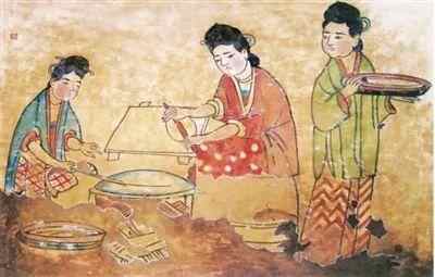 在甘肃省河西地区,发掘出大批魏晋时代的壁画砖墓,其中多幅“烙饼图”引人注目。1972年,甘肃省嘉峪关市魏晋壁画墓发掘的一幅烙饼图中,一名女子正手持面皮往鏊子上放。1993年,甘肃省酒泉市果园乡西沟村魏晋墓也发现了“烙饼图”,一女子头梳发髻,跪坐在三足平底鏊子前烙饼,身后放有两个大盆。