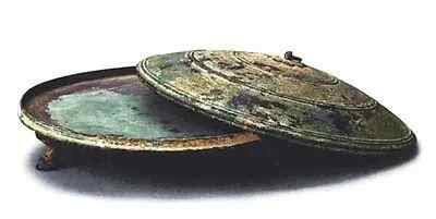 青铜鏊由盖和体两部分组成,盖呈伞状,上饰两组弦纹,顶部有一桥形钮,钮下饰以梅花形饰片,钮上套一圆形提环。体为圆形浅盘,平底,下附三蹄足。盖周边有和鏊面扣合的子母口,上下合体十分严密。据考证,这是我国考古发现最早的带盖青铜鏊,是研究古代饮食文化的珍贵实物资料。