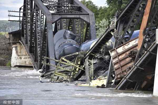 24日凌晨,蒙大拿州一列火车在经过黄石河铁路大桥时脱轨,导致桥梁断裂,8节车厢损毁,部分车厢还流出黄色液体(下图)。对此,附近的黄石县关闭了下游饮用水泵,并要求居民节约用水。