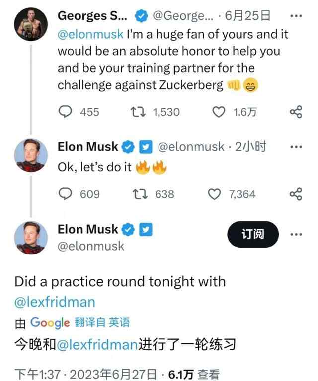 27日,马斯克还回应了加拿大职业综合格斗选手乔治·圣皮埃尔的推特,同意由他帮助自己进行训练,为决战扎克伯格做准备。