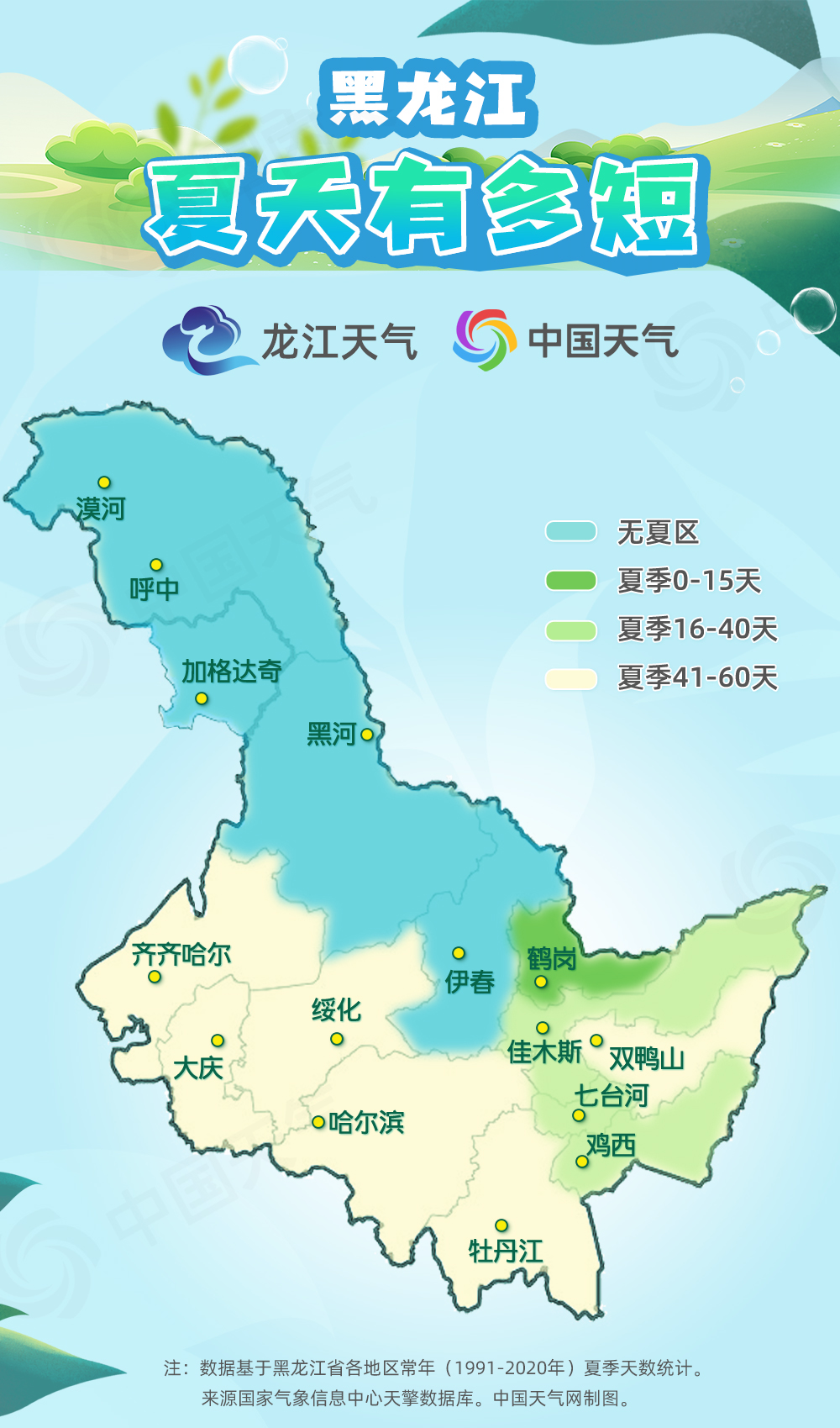 据黑龙江省各地区常年(1991-2020年)夏季日数统计显示,鹤岗夏天最短,仅有13天;其次是鸡西、七台河、佳木斯,夏季长度在16-40天之间。夏季最长的要属哈尔滨了,不过也只有58天,还不足两个月。