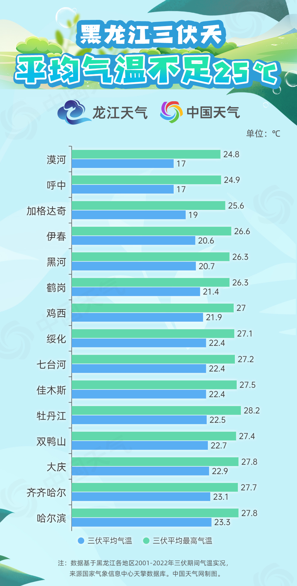 气象监测数据显示,2001至2022年期间,黑龙江各地区三伏天期间的平均最低气温均在18℃以下,平均最高气温在28℃以下,除哈尔滨日平均气温23.3℃,其他地区平均气温在23℃以下。其中有着“冷极”之称的漠河和被称作“中国最冷小镇”的呼中,它们的平均最高气温均不足25℃,平均最低气温不足10℃,对于避暑来说是绝佳选择。