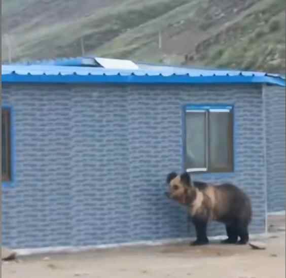 随后,大熊对路边一间简易房子产生“兴趣”,掀翻了窗户下方的墙壁后闯入。