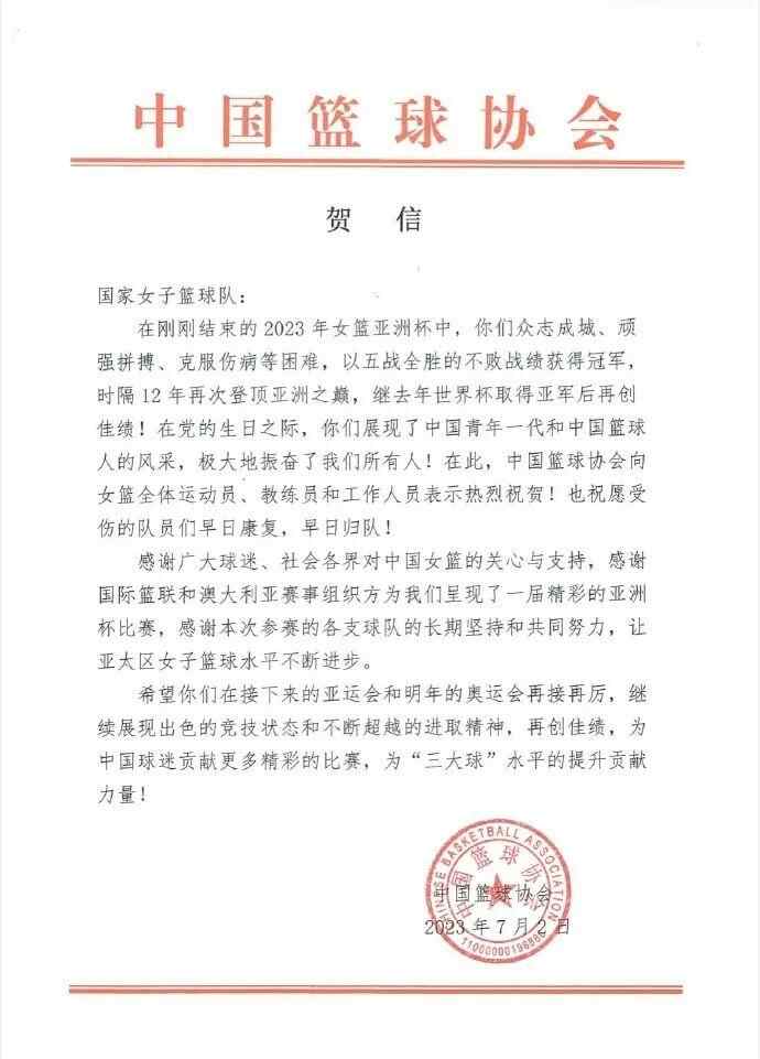 在刚刚结束的2023年女篮亚洲杯中,你们众志成城、顽强拼搏、克服伤病等困难,以五战全胜的不败战绩获得冠军,时隔12年再次登顶亚洲之巅,继去年世界杯取得亚军后再创佳绩!在党的生日之际,你们展现了中国青年一代和中国篮球人的风采,极大地振奋了我们所有人!在此,中国篮球协会向女篮全体运动员、教练员和工作人员表示热烈祝贺!也祝愿受伤的队员们早日康复,早日归队!