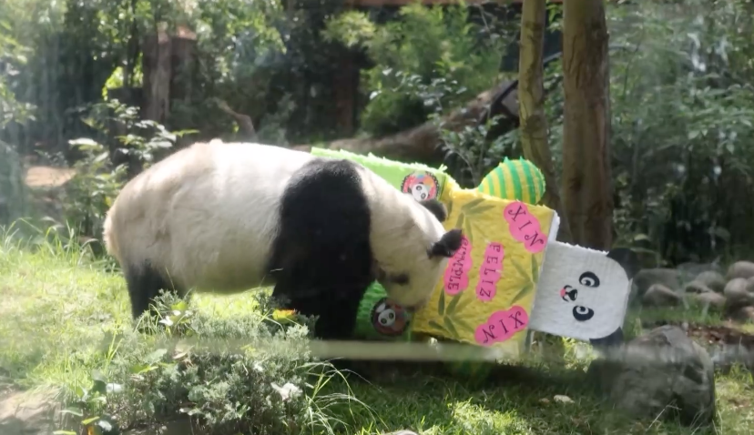 总台记者盛嘉迪:我们身后的就是大熊猫,中墨友谊的使者。大熊猫欣欣正在庆祝她的33岁生日。我们碰到一个墨西哥小朋友,听听她有什么生日祝愿送给欣欣。