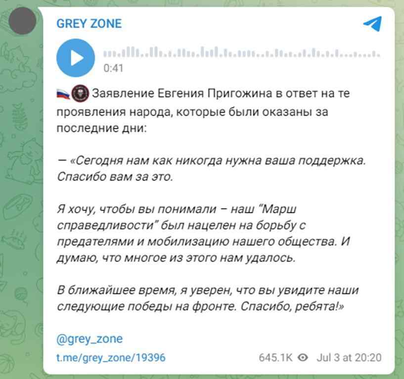 Grey Zone 电报频道在俄罗斯社交媒体 Telegram 上发布了一段普里戈任的录音,里面讲道:“我们的‘正义游行’旨在打击叛徒并动员我们的社会,我认为我们取得了很大的成就。在不久的将来,我相信大家会看到我们在前线取得的下一场胜利,谢谢。”