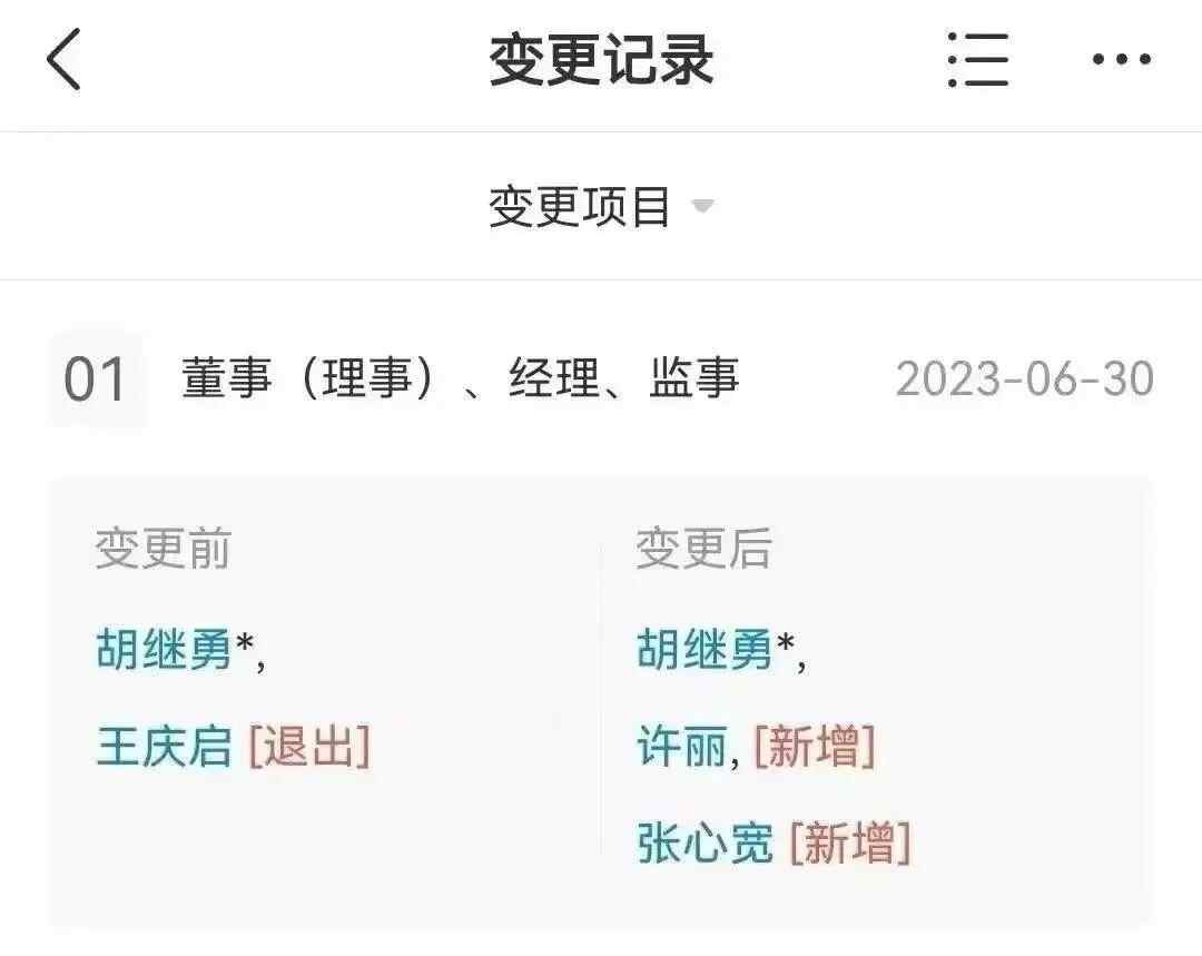 监事王庆启退出高管行列,新增许丽为监事、张心宽为财务负责人,而此前被通报免职的胡继勇仍为该公司法定代表人、执行董事。