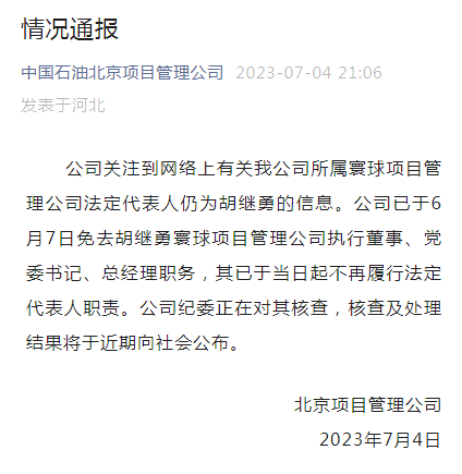 中国石油北京项目管理公司4日发布《情况通报》:公司关注到网络上有关我公司所属寰球项目管理公司法定代表人仍为胡继勇的信息。公司已于6月7日免去胡继勇寰球项目管理公司执行董事、党委书记、总经理职务,其已于当日起不再履行法定代表人职责。公司纪委正在对其核查,核查及处理结果将于近期向社会公布。