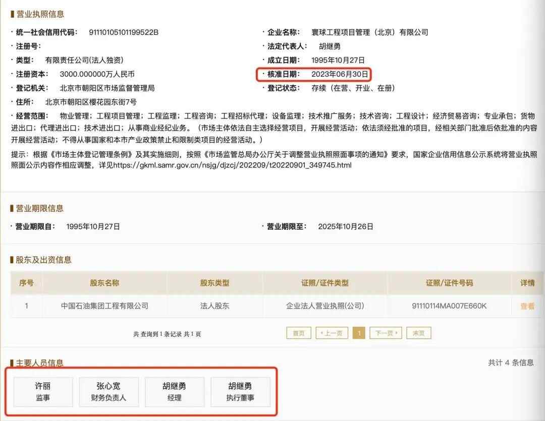 据企查查显示,寰球工程项目管理(北京)有限公司成立于1995年,企业注册资本3000万元人民币,为中国石油集团工程有限公司的全资子公司。