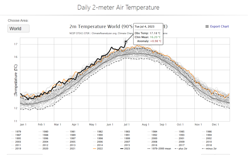 来自缅因大学气候研究所的信息显示,7月4日,地球表面以上2米的全球平均气温达到17.18℃。这打破了7月3日刚刚创下的17.01℃的纪录。这是自1979年有记录以来,全球平均气温第二次超过17℃,也使7月4日成为有记录以来全球平均气温最高的一天。
