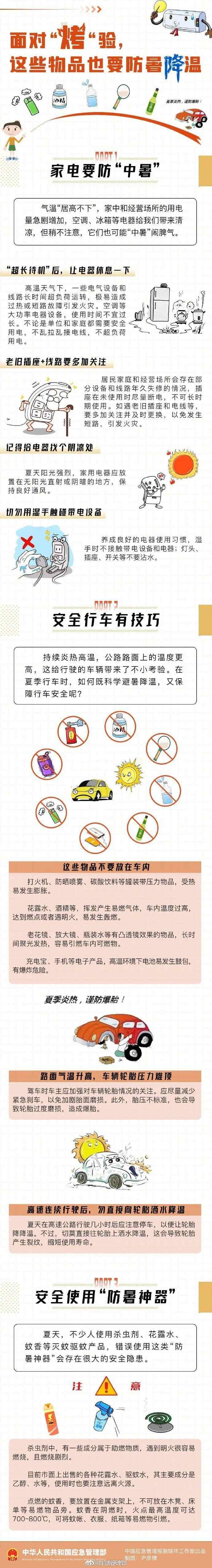 高温天气,面对“烤”验,除了要做好个人的防暑降温措施,还要记得给日常生活中的这些物品“防暑降温”,谨防安全隐患↓↓↓