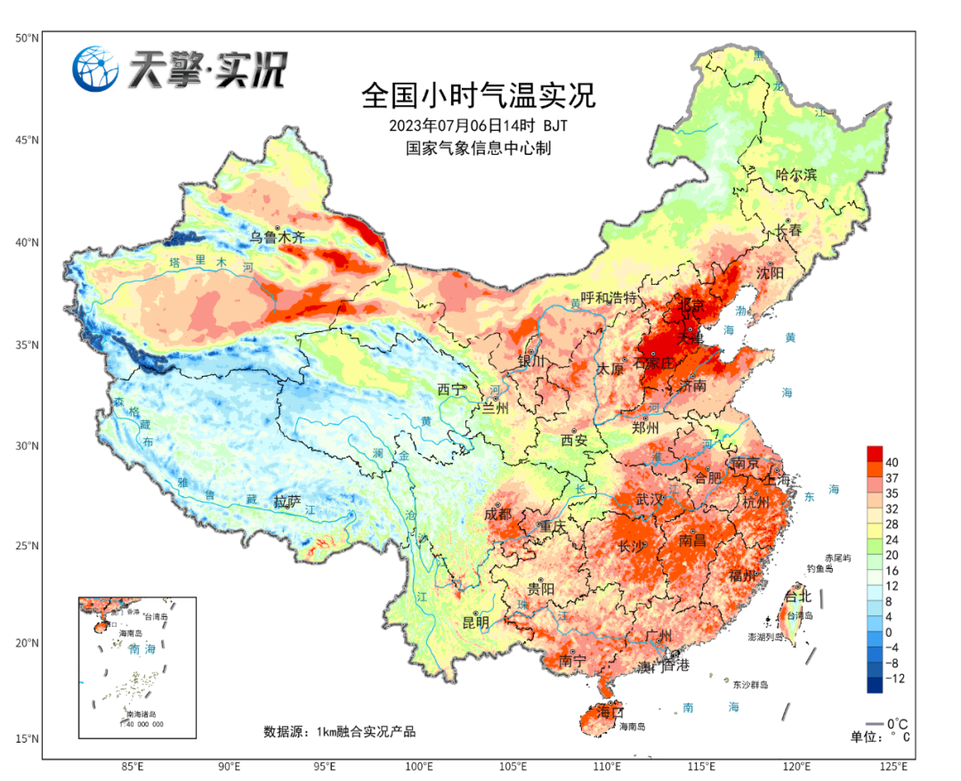 截至7月6日14时,南北方都有大片高温出现。北方主要集中在北京、天津、河北、辽宁南部、山东北部。南方高温出现在湖南、江西、湖北南部、福建、浙江等地。