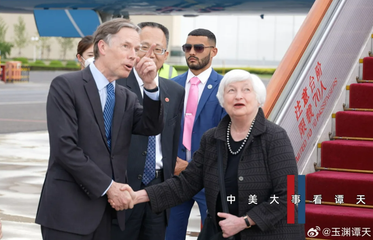 7月6日下午,美国财政部部长珍妮特·耶伦乘机抵达北京,走下飞机与中方握手时长近20秒。耶伦抵达时,北京的天空刚好出现一道彩虹。中国财政部国际经济关系司司长杨英明和美国驻华大使伯恩斯都给耶伦指了指天上的这道彩虹(下图)。这对美方来说,也是一种提醒——中美关系,带着诚意来,互相尊重,才能雨过天晴。