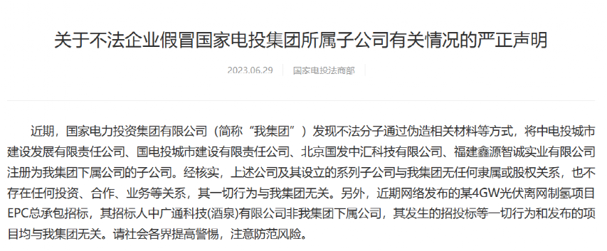 更早的6月29日,国家电投发布《关于不法企业假冒国家电投集团所属子公司有关情况的严正声明》。声明称,近期国家电投发现不法分子通过伪造相关材料等方式,将中电投城市建设发展有限责任公司、国电投城市建设有限责任公司、北京国发中汇科技有限公司、福建鑫源智诚实业有限公司注册为集团下属公司的子公司。