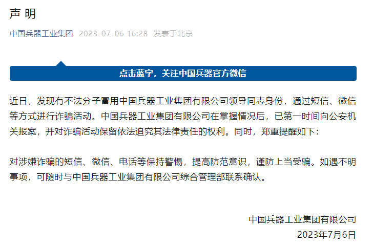 7月6日,中国兵器工业集团有限公司发布声明称,近日,有不法分子冒用中国兵器工业集团有限公司领导同志身份,通过短信、微信等方式进行诈骗活动。中国兵器工业集团有限公司表示,在掌握情况后,已第一时间向公安机关报案,并对诈骗活动保留依法追究其法律责任的权利。