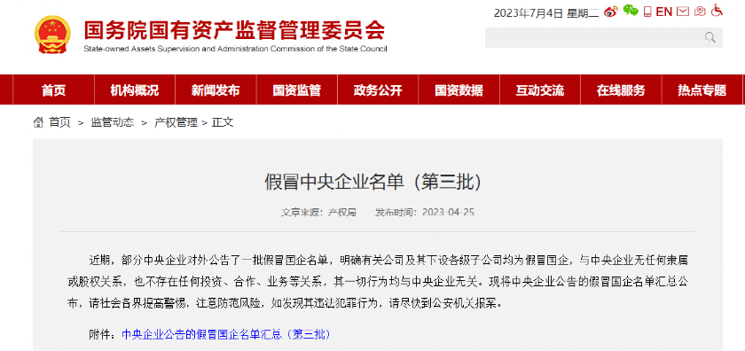 今年4月,国务院国资委公布第三批假冒“央企”295家名单,明确有关公司及其下设各级子公司均为假冒国企,与中央企业无任何隶属或股权关系,也不存在任何投资、合作、业务等关系。