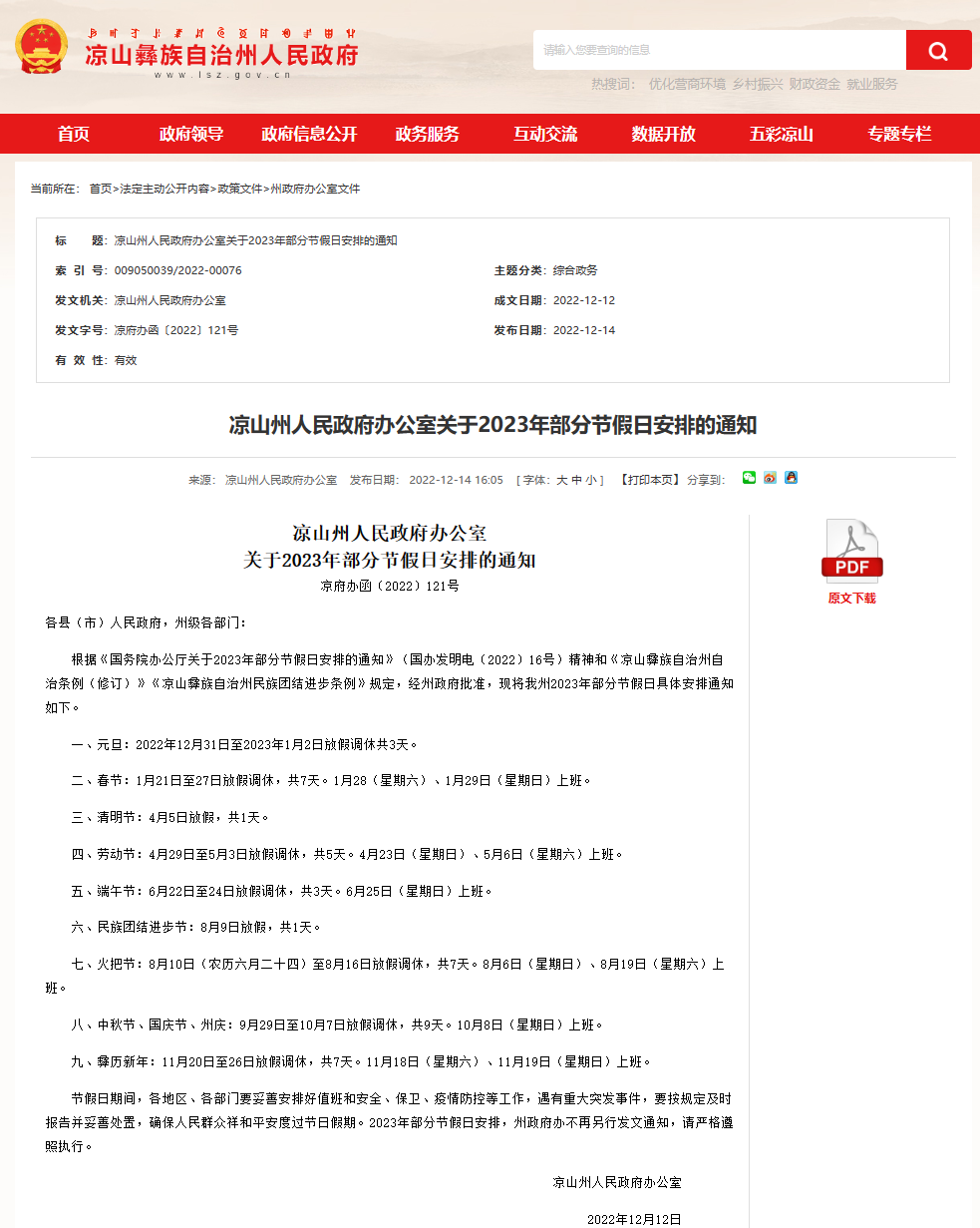 据凉山州人民政府办公室此前发布的《凉山州人民政府办公室关于2023年部分节假日安排的通知》,火把节:8月10日(农历六月二十四)至8月16日放假调休,共7天。