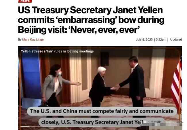 7月8日,国务院副总理、中美经贸中方牵头人何立峰会见美财长耶伦。有美媒对耶伦在会面时3次礼貌鞠躬不满。《纽约邮报》援引一名美国前官员的话称,耶伦此举被视为“美国软弱”的表现。“这就好像她是个小学生,被校长叫去谈话了一样”。