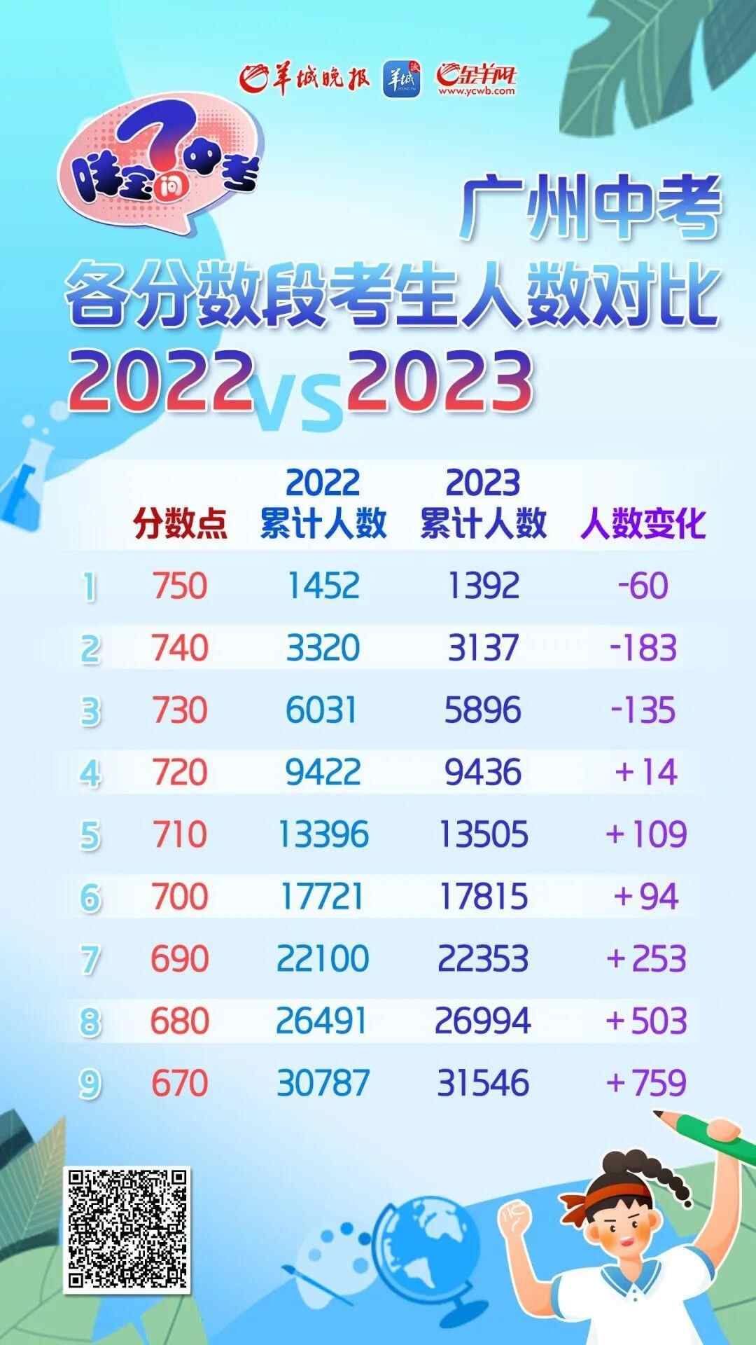 分数一定程度上反映考题的难易。广州市招考办每年都会发布“广州市中考分数段统计表(含各项政策性加分)”,记者对比了2022年和2023年的数据:750分、740分、730分以上的高分考生,比去年分别减少60人、183人、135人。说明中考考题的区分度有所提升,后续几届的学弟学妹们,扎实基础的同时,也要冲难题。