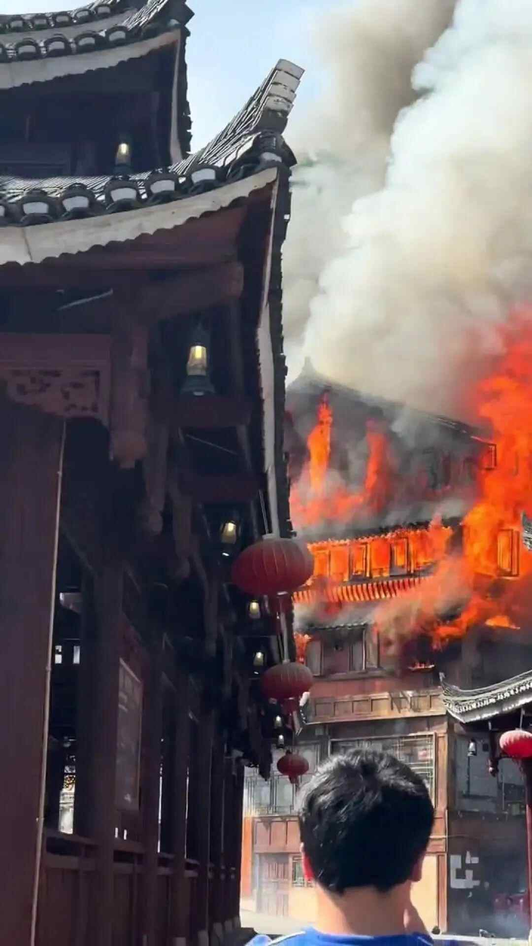 视频显示,西江千户苗寨景区木质结构建筑起火,现场浓烟滚滚,周围有大量游客驻足,有人员在用水枪灭火。