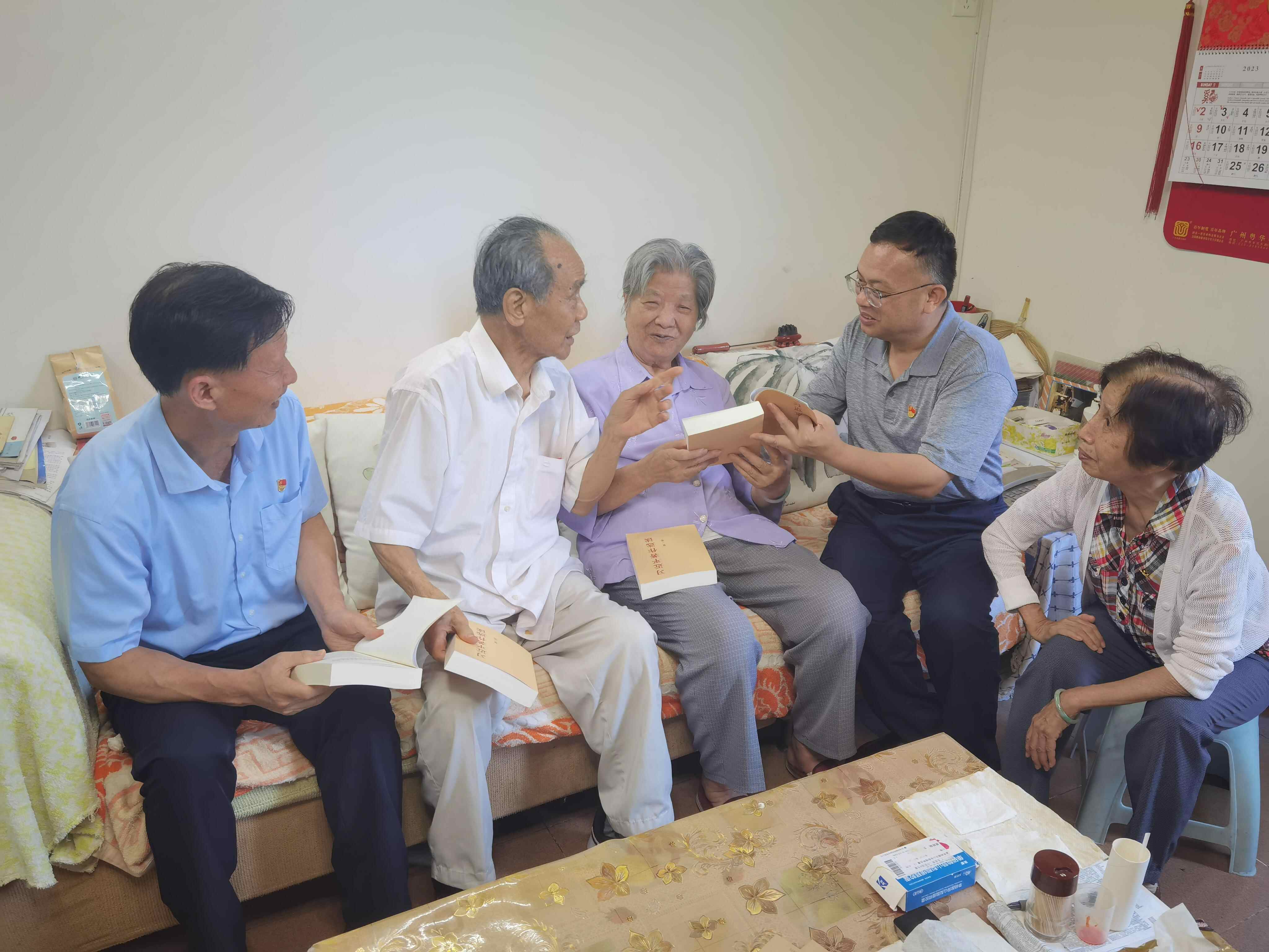 在中心党委书记邓选成、专职副书记张福先等同志“送学上门+上门听学”时,廖佩贤讲述了她的入党初心故事,分享了自己的人生感悟。她反复强调学习是一个持续积累的过程,要活到老,学到老。讲到自己对马克思主义哲学的认识学习经历了一段心路历程,一开始觉得晦涩难懂,她就逐字逐句“死磕”。搞不懂的,就查阅资料、工具书,多读几遍、反复思考,力求搞明白,形成自己的理解,记录在本子上,并运用到生活实践中,在反复研读、思辨、践行中不断提高思想理论水平。她时常寄语年轻党员,当感到困惑、迷茫、不知所措时,就静下心来读读马克思主义哲学和习近平新时代中国特色社会主义思想,读着读着就会豁然开朗。此外,还劝导年轻人要多吃苦、多锻炼,如今自己身体健朗就是得益于年轻时经常劳动锻炼出来的。
