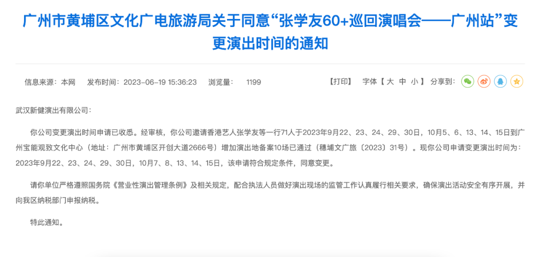 值得一提的是,本次演唱会极有可能有多次加场。根据广州市黄埔区文化广电旅游局的报批信息,张学友预计在广州演出10场,时间为2023年9月22日、23日、24日、29日、30日,10月7日、8日、13日、14日、15日。据悉,广州宝能观致文化中心单场可容纳超过1.8万人。