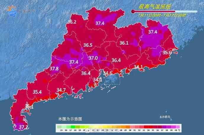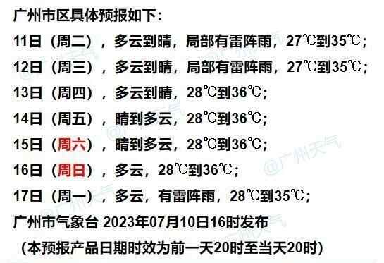 11日,韶关、清远、肇庆、云浮、粤西、珠三角南部市县晴到多云,有分散雷阵雨局部大雨或暴雨,其余市县晴间多云,午后局部有雷阵雨。最高气温:除雷州半岛外的南部沿海市县31℃~33℃,其余市县33℃~36℃,局部37℃左右。