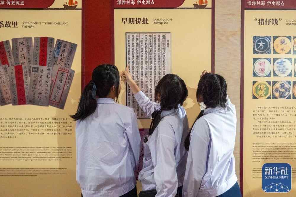 7月9日,在泰国曼谷,当地学生参观“三江出海 一纸还乡”侨批历史文化展。新华社记者 林昊 摄