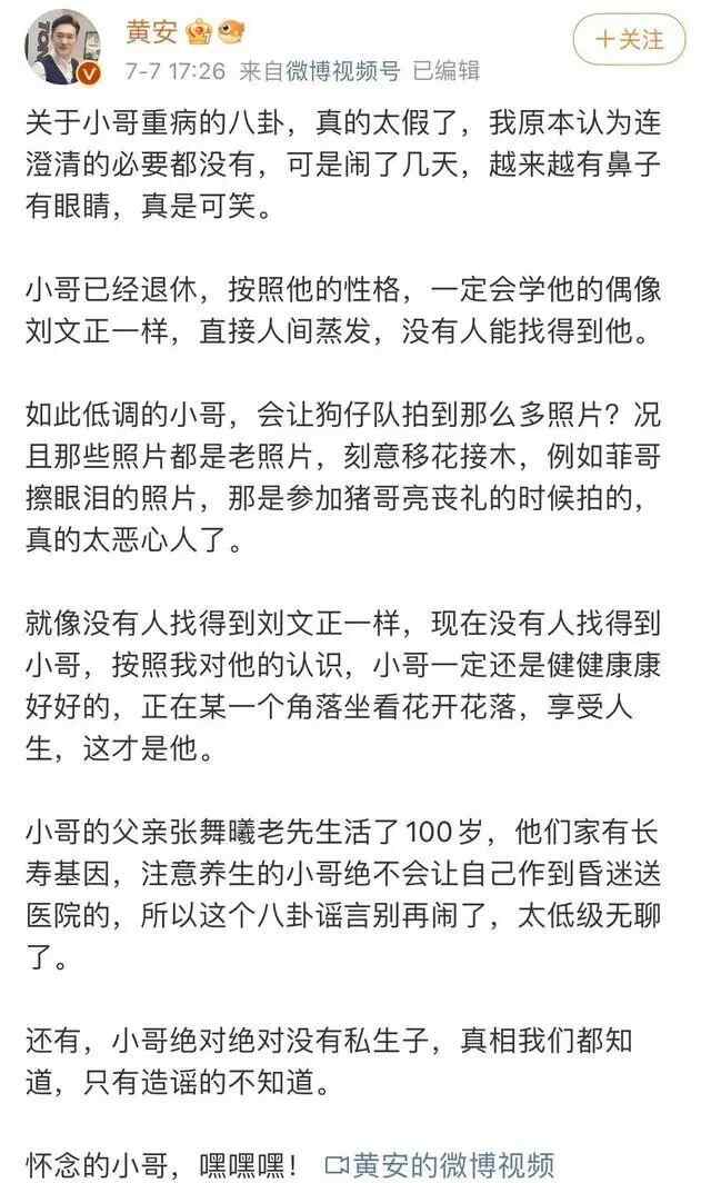 他在文中提到:“关于小哥重病的八卦,真的太假了”“小哥已经退休,按照他的性格,一定会学他的偶像刘文正一样,直接人间蒸发,没有人能找得到他”“那些照片都是老照片,刻意移花接木,真的太恶心人了”。