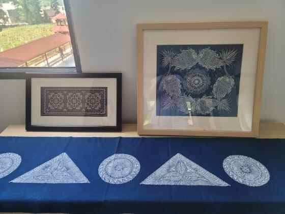 贵州纳雍县猪场乡湾子村农民专业合作社非遗工坊展厅展出的蜡染作品。
