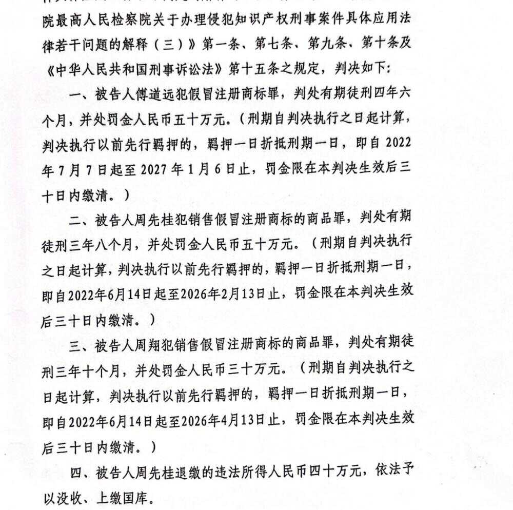 2023年3月29日,长沙市天心区法院判决,傅某远、周某桂、周某犯销售假冒注册商标的商品罪,判处有期徒刑四年六个月、三年八个月、三年十个月,并分别处罚金。周某桂退缴的违法所得40万元依法予以没收,上缴国库。