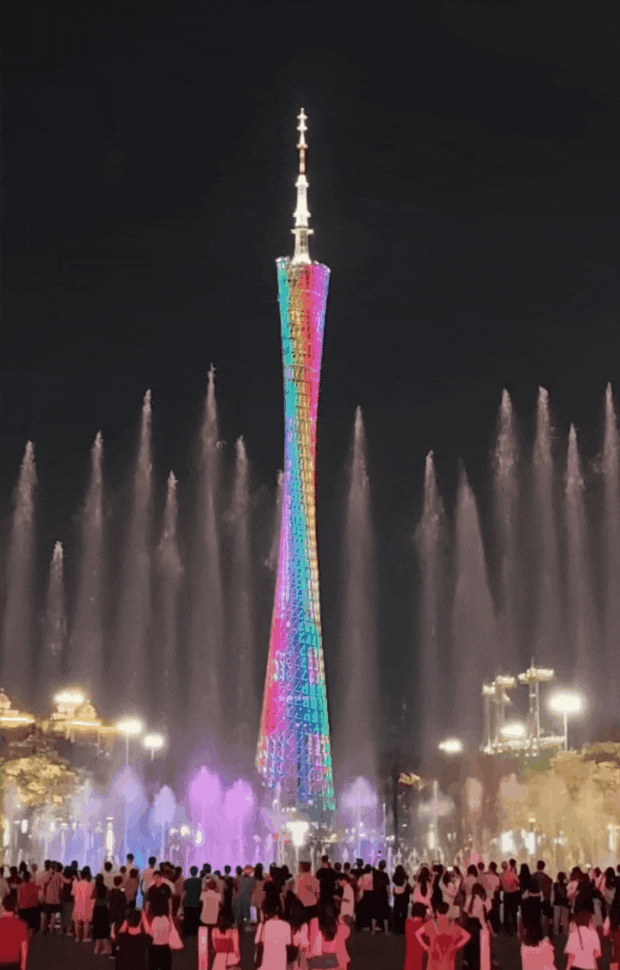 广州塔和音乐喷泉同框的美景