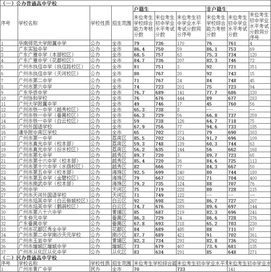 根据市招考办公布的《2023年广州市高中阶段学校招生录取分数(第一批次招生学校)》,广州大学附属中学目前公布的自招结果显示,广州市执信中学天河校区户籍生末位考生中考成绩为767分、校内综合能力考核为80分;广州市第二中学户籍生末位考生中考成绩767分、校内综合能力考核成绩为71分。