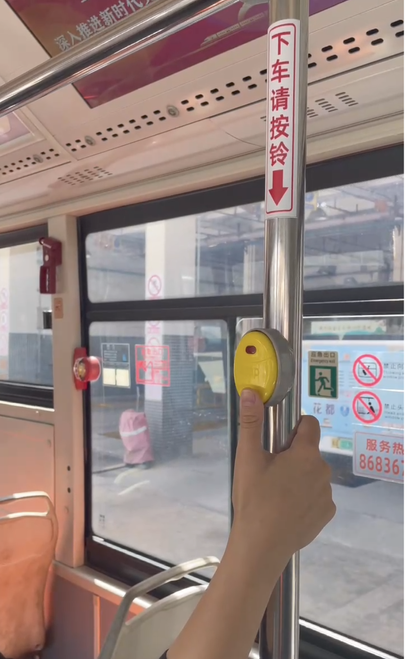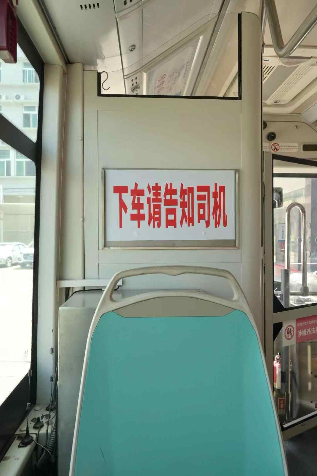 7月12日,记者在广州花都区新雅街道办总站乘坐花68路,这是此次试行“响应停靠,慢驶过站”的线路之一。记者在车内看到,在司机驾驶室后方已设置“下车请告知司机”的提示牌,在后车门左手边的扶手栏杆上设置了下车铃,并标有“下车请按铃”的指示。