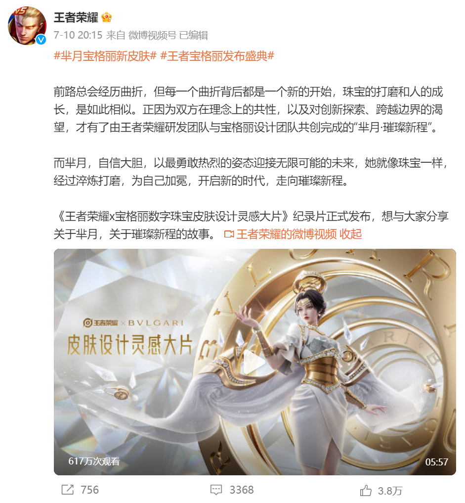 7月12日,有网友发现游戏王者荣耀已经下架与宝格丽合作的数字珠宝“芈月皮肤”活动页面。