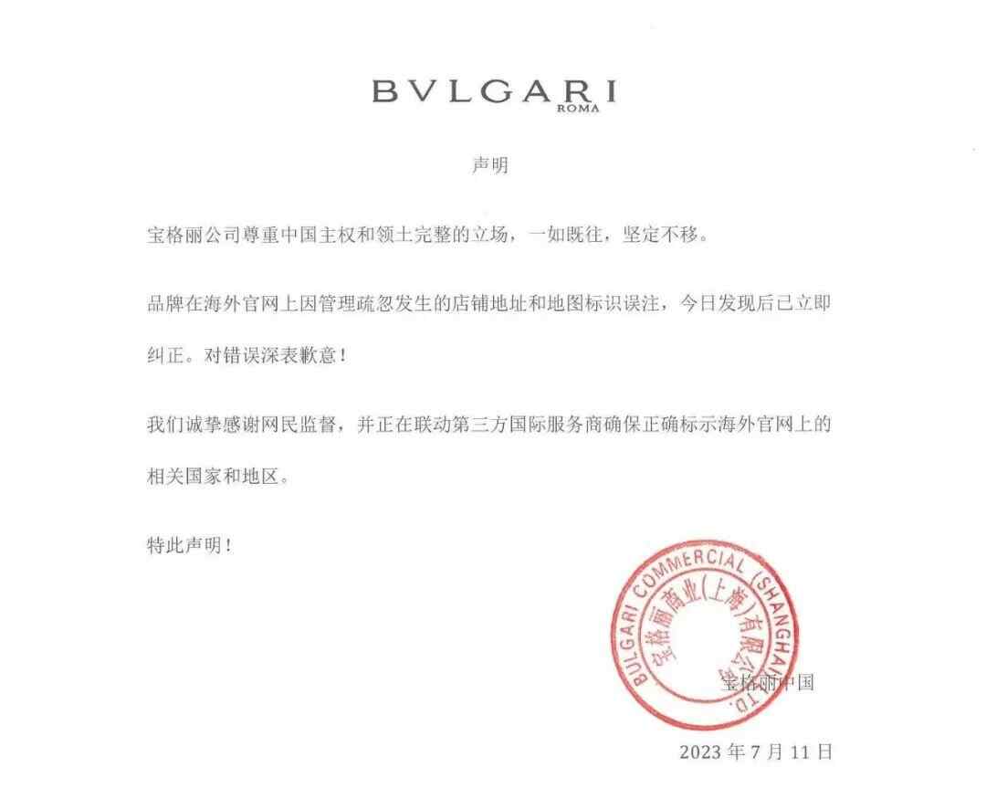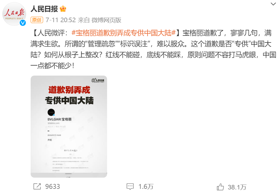 7月11日晚,人民日报对此事发表评论:宝格丽道歉别弄成专供中国大陆。中国一点都不能少!