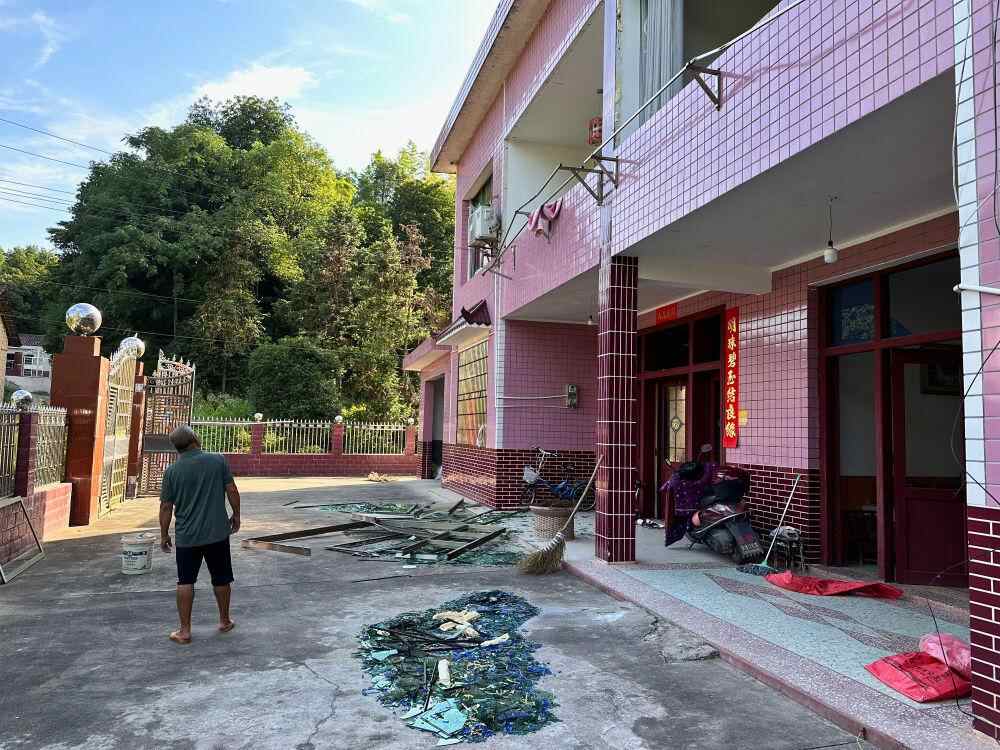 记者在现场看到,周边数户村民家铝合金大门、窗户都已严重变形,屋门口散落着厚厚的玻璃碎渣,房屋内部一片狼藉,还有村民房屋墙体出现裂痕。