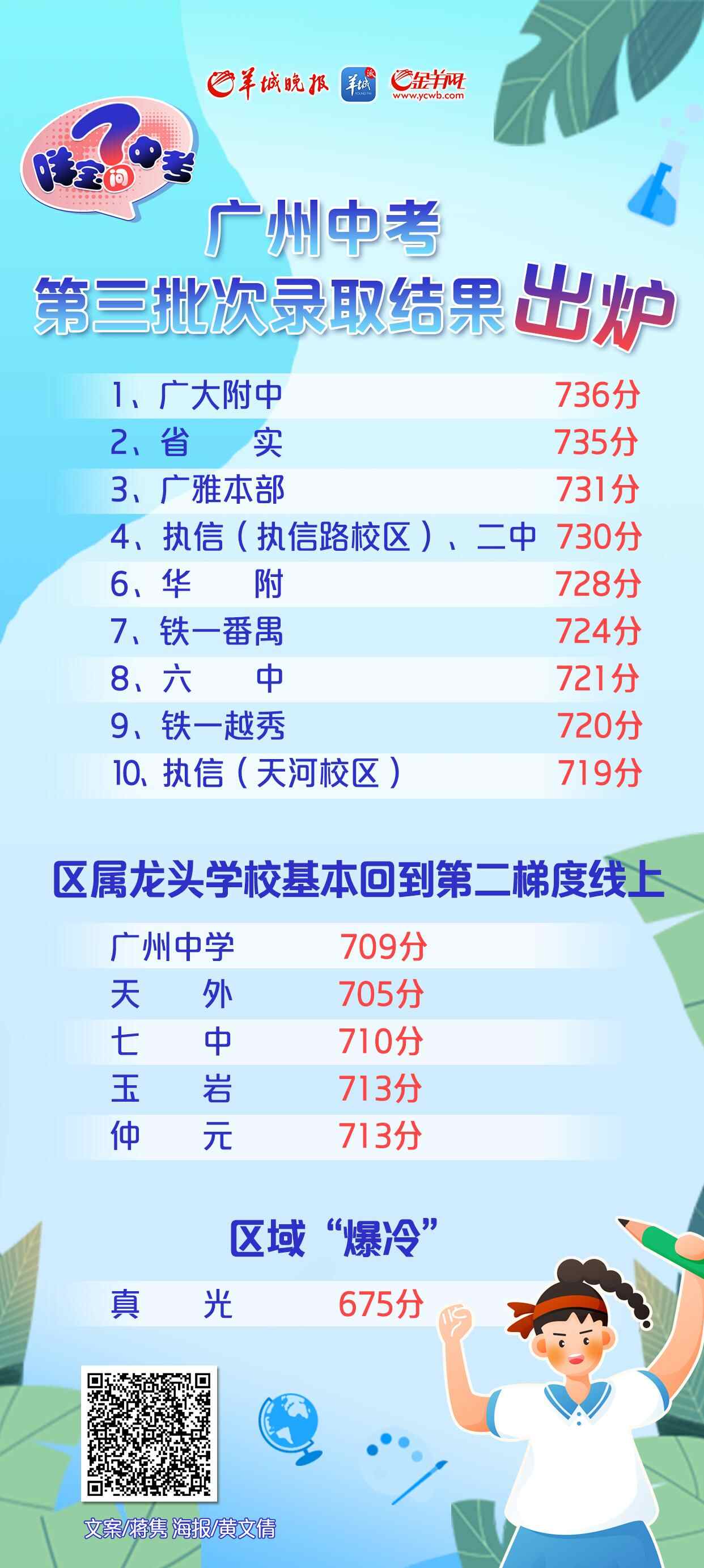 录取分数排行榜前十名分别为:第一为广大附中736分;第二为省实735分;第三为广雅本部731分;执信(执信路校区)、二中730分并列第四;第六为华附728分,第七为铁一(番禺校区)724分,第八为六中721分,第九为铁一(越秀校区)720分,第十为执信(天河校区)719分。