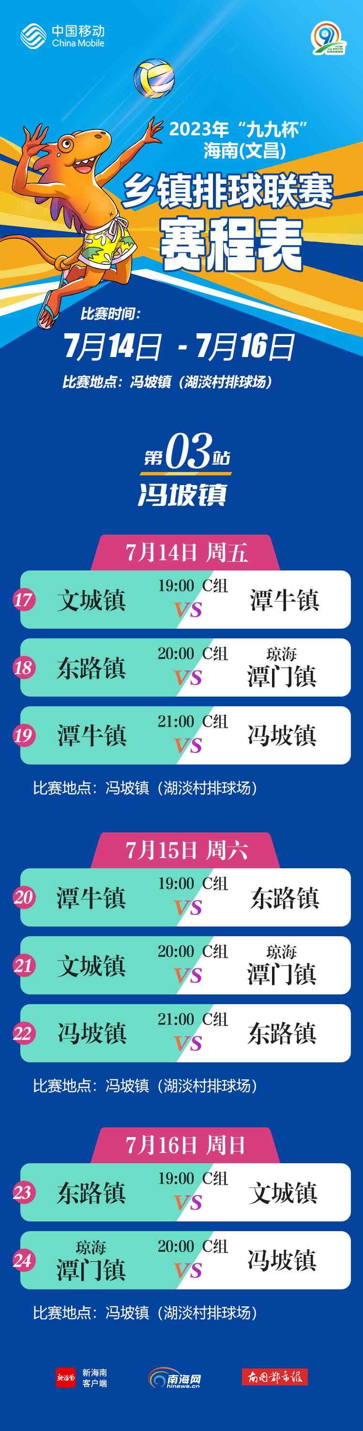 新海南客户端、南海网7月13日消息(记者 吴岳文)7月14日,2023年“九九杯”海南(文昌)乡镇排球联赛小组赛C组比赛将在“中国排球之乡”文昌市冯坡镇昌里村委会湖淡村举行,为广大观众呈现8场精彩的决战盛宴。前往湖淡村观看球赛的球迷们可在文昌市排球馆乘坐免费的专线巴士。