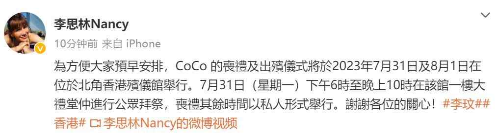为方便大家预早安排,CoCo 的丧礼及出殡仪式将于2023年7月31日及8月1日在位于北角香港殡仪馆举行。7月31日(星期一)下午6时至晚上10时在该馆一楼大礼堂中进行公众拜祭,丧礼其余时间以私人形式举行。谢谢各位的关心!