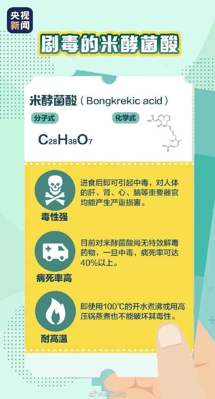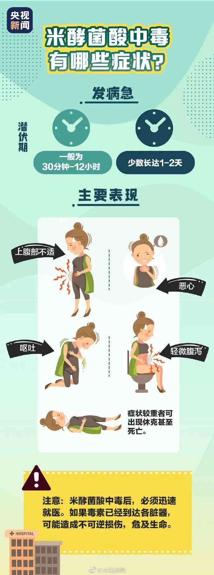 据广东疾控提醒:食用了被米酵菌酸污染的食物后,一般30分钟左右开始出现中毒症状,首先是恶心呕吐、腹泻腹痛、头晕无力,进一步发展到严重的肝功能损害、意识不清,甚至死亡。不幸的是,目前还没有特效解毒药物,一旦中毒,病死率高达40%。