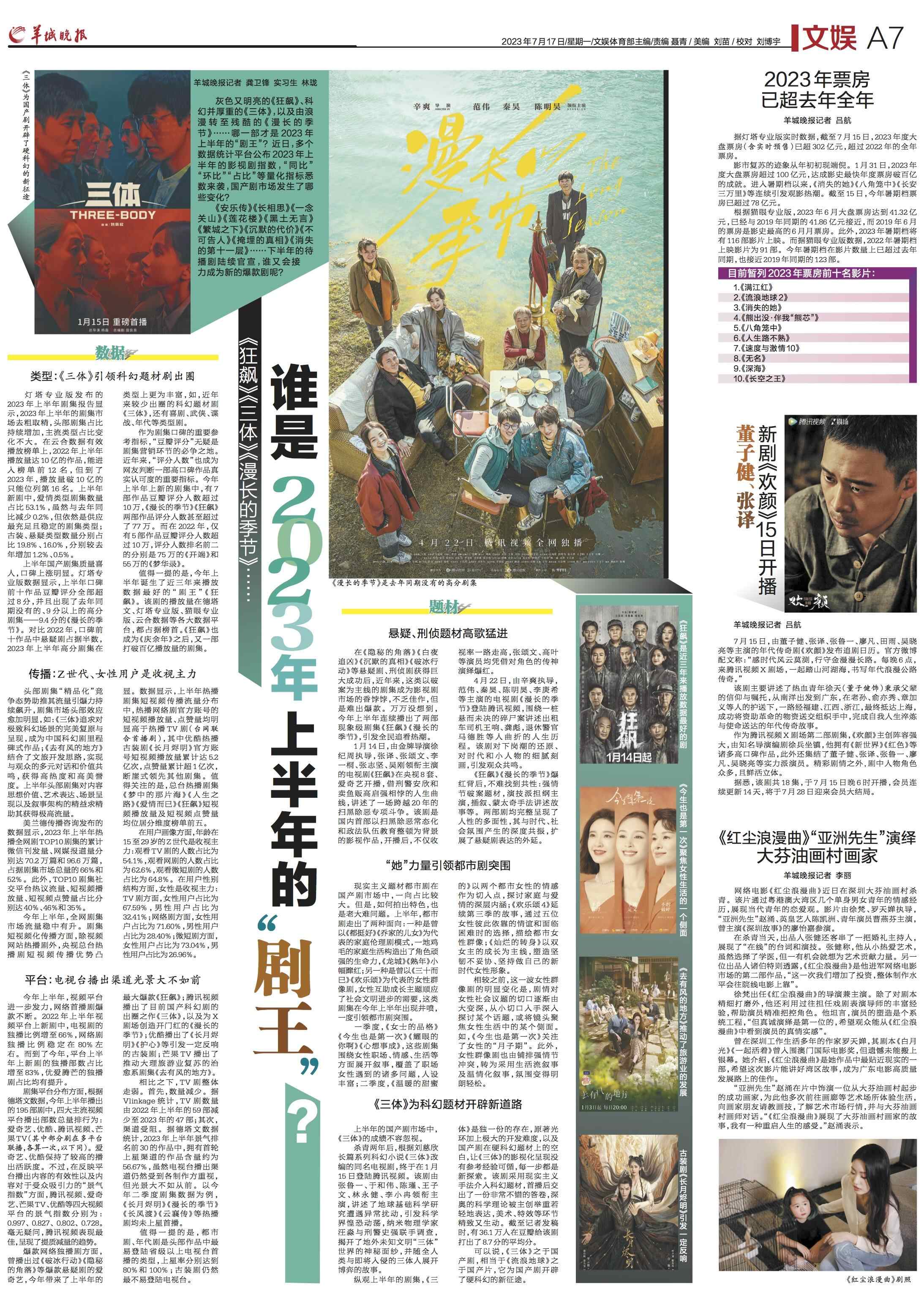 灰色又明亮的《狂飙》、科幻并厚重的《三体》,以及由浪漫转至残酷的《漫长的季节》……哪一部才是2023年上半年的“剧王”?近日,多个数据统计平台公布2023年上半年的影视剧指数,“同比”“环比”“占比”等量化指标悉数来袭,国产剧市场发生了哪些变化?